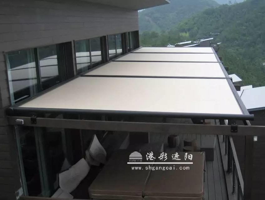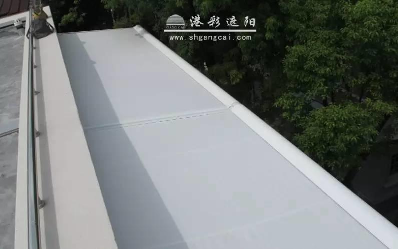 现在,小编给大家推荐一款主要针对阳光房的外遮阳产品——港彩重型带式天幕。它最大单套尺寸可达7M*伸出7M,大面积遮阳时采用多套组合拼接。
