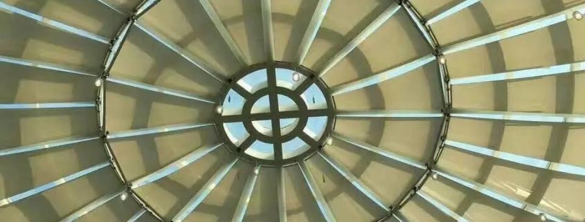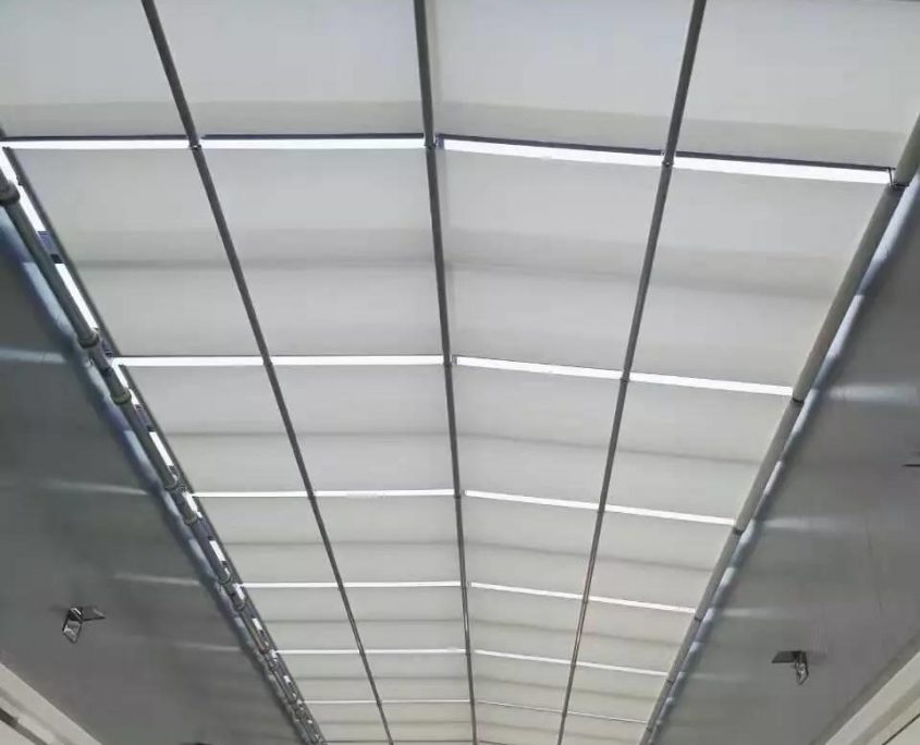 FSS天蓬帘是一种单电机弹性牵引机构、电机、弹簧分别装在天蓬帘两端的卷管中,电机一端的卷管上装有卷绳器,面料一端贴在装有弹簧的卷管上,面料前端装有牵引杆、钢丝绳的两端分别从牵引杆上固定的牵引滑轮处穿过固定到对面的卷绳器上。利用电机作为动力,通过电机的转动带动弹簧机构产生回弹力,从而使面料在运行或静止时保持张紧状态。在电机和弹簧扭力的作用下完成面料绷紧收放,起到遮阳调光的效果。天棚关闭时面料稍微下垂。因FSS系统张力较大,需选用有一定抗拉强度的遮阳面料。