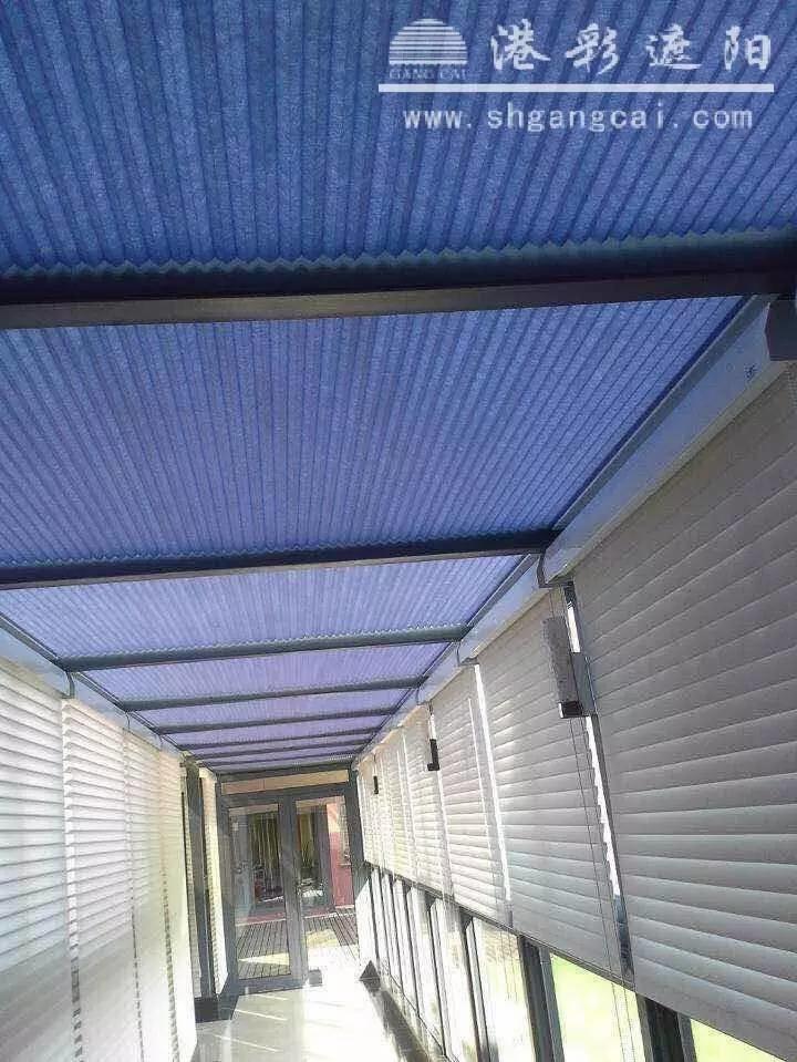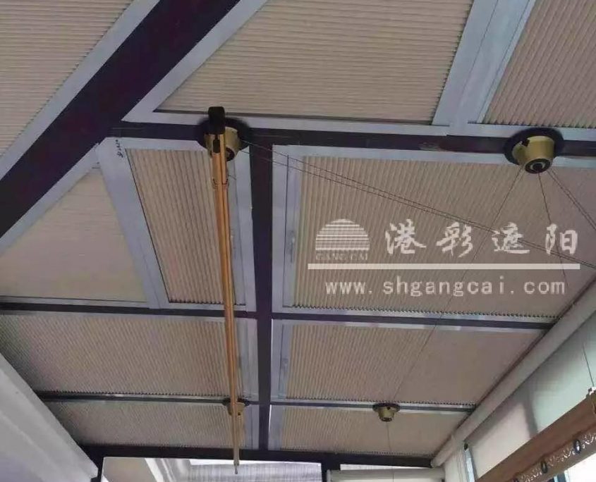 蜂巢帘系统采用蜂巢帘片进行遮阳,蜂巢帘片因其独特结构遮阳隔热效果佳,有多种不同厚度、不同颜色的帘片可供选择,是一款视觉及遮阳效果明显的天棚帘,十分适合格调高雅的场所,特别适合不规则的中,小面积的阳光房。但因其不适合大面积遮阳,因此对大面积阳光房来说不太适用。而立面选用室内蜂巢帘,可保证遮阳系统的整体协调感,达到最佳的设计视觉效果。室内蜂巢帘控制方式电动手动均可选择。单幅尺寸宽度≤1.6M,伸出≤5M。