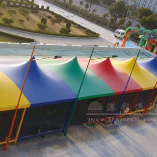 举例代表A : 法国Ferrari 502彩色系列膜材,克重570g/m2,防火等级B1级,面料遮阳防雨,质保5年。一般用于户外小型景观、固定式遮阳篷、帐篷等。