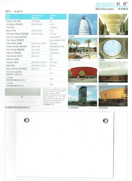 举例代表A :德国杜肯B 6617白色膜材,克重1000g/m2,防火等级B1级,遮阳防雨,质保15年。一般用于中型户外景观、帐篷等。