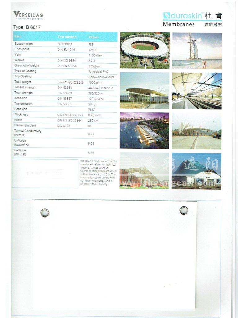德国杜肯 6617白色膜材 克重1000g/㎡,防火等级B1级,遮阳防雨,质保15年。一般用于中型户外景观、帐篷等。