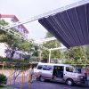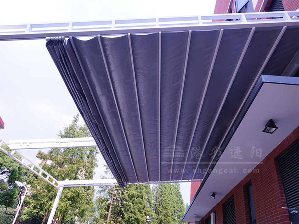 折叠轨道天棚是一款能同时满足遮阳、遮雨、抗大风等需求的户外遮阳产品,面积大,用于户外休闲也可扩展仓储空间;篷布收拢后只剩下外框架,满足当下严格的消防规定。